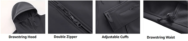 【Humanized Design】Drawstring waist and hood. Elastic, hook & loop adjustable wrist cuffs. Featuring adjustable hem and cuffs to help protect against wind and keep you warm inside.There are headphone holes on the inside of the jacket to help with the hidden use of wired headphones.