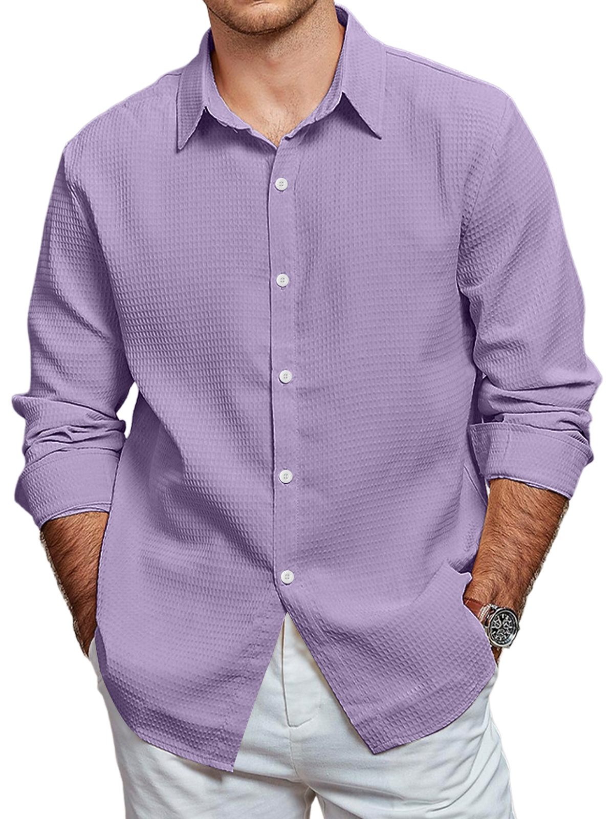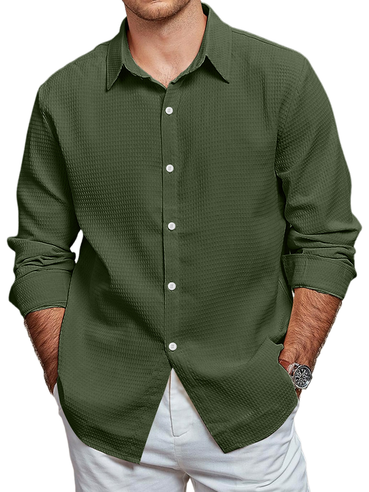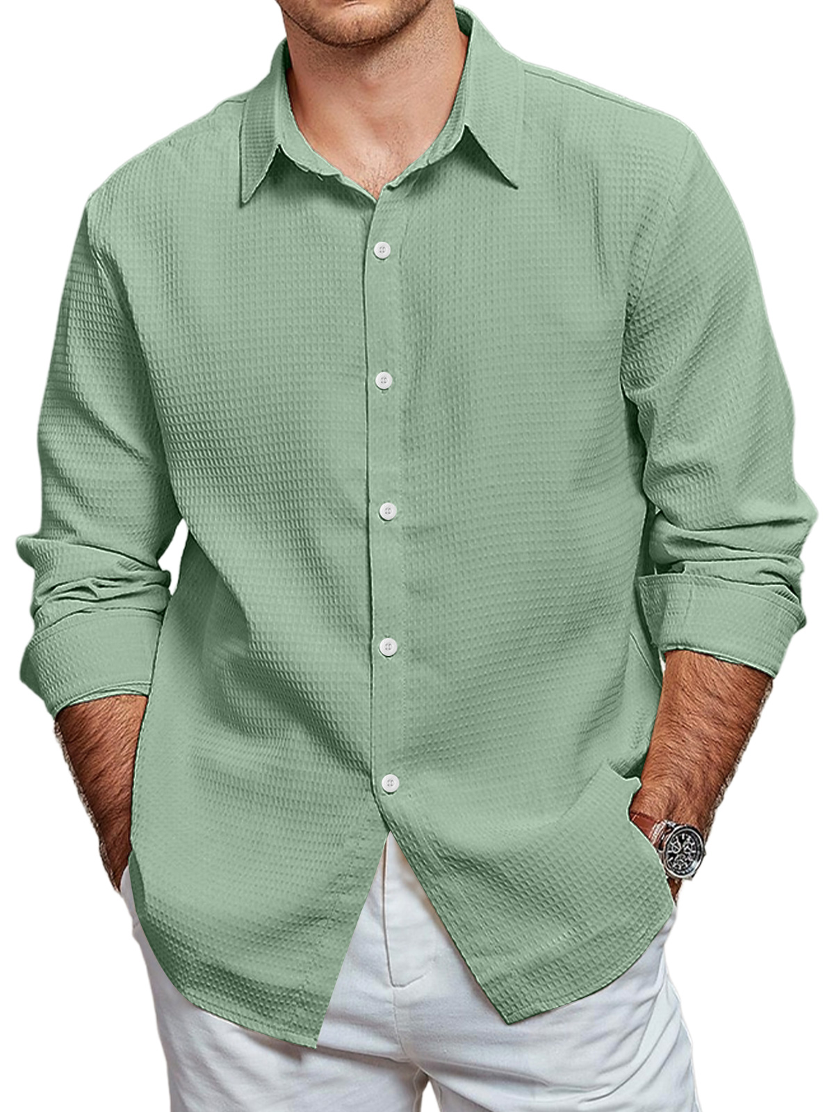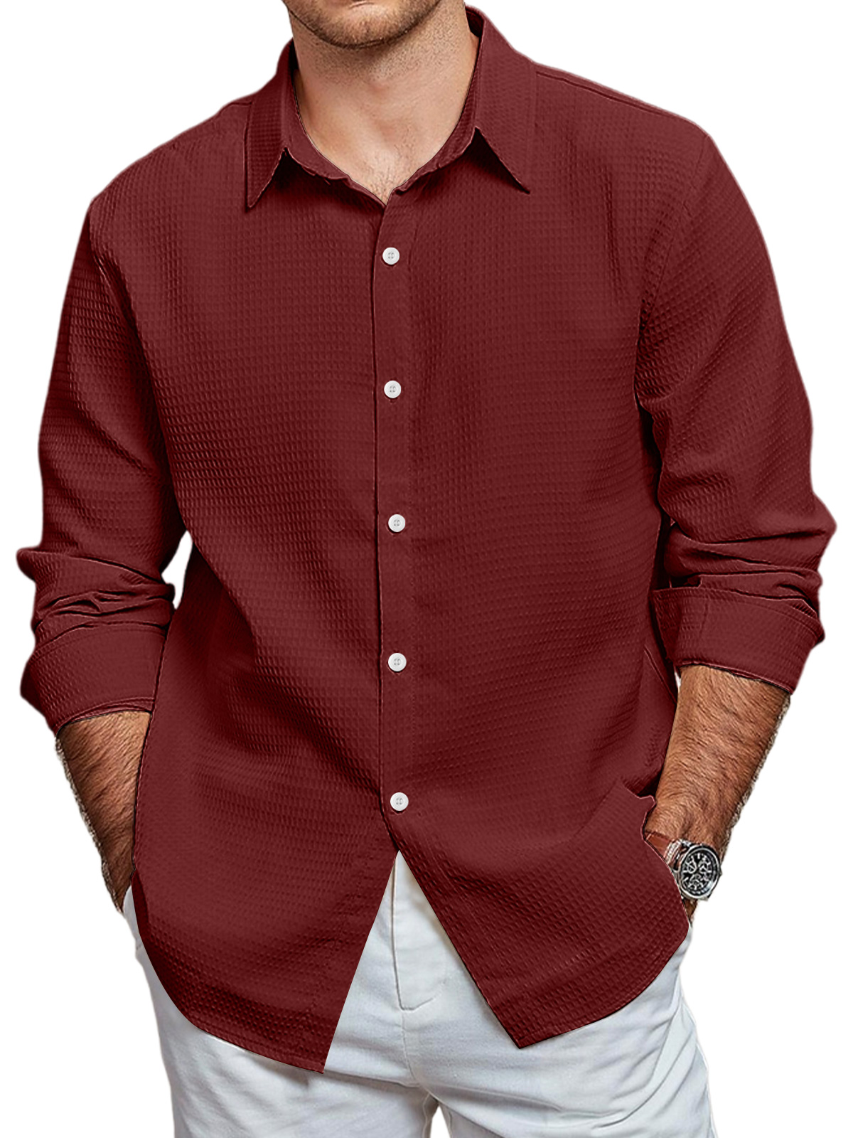 • Men's Casual Waffle Solid Color Long Sleeve Shirt
