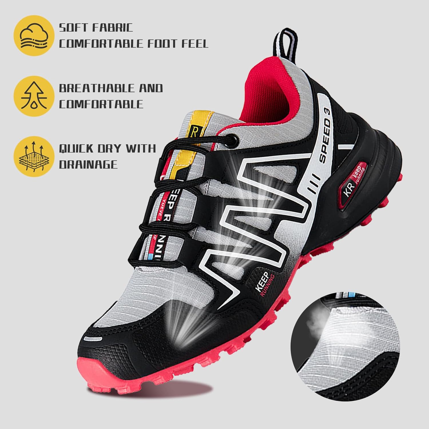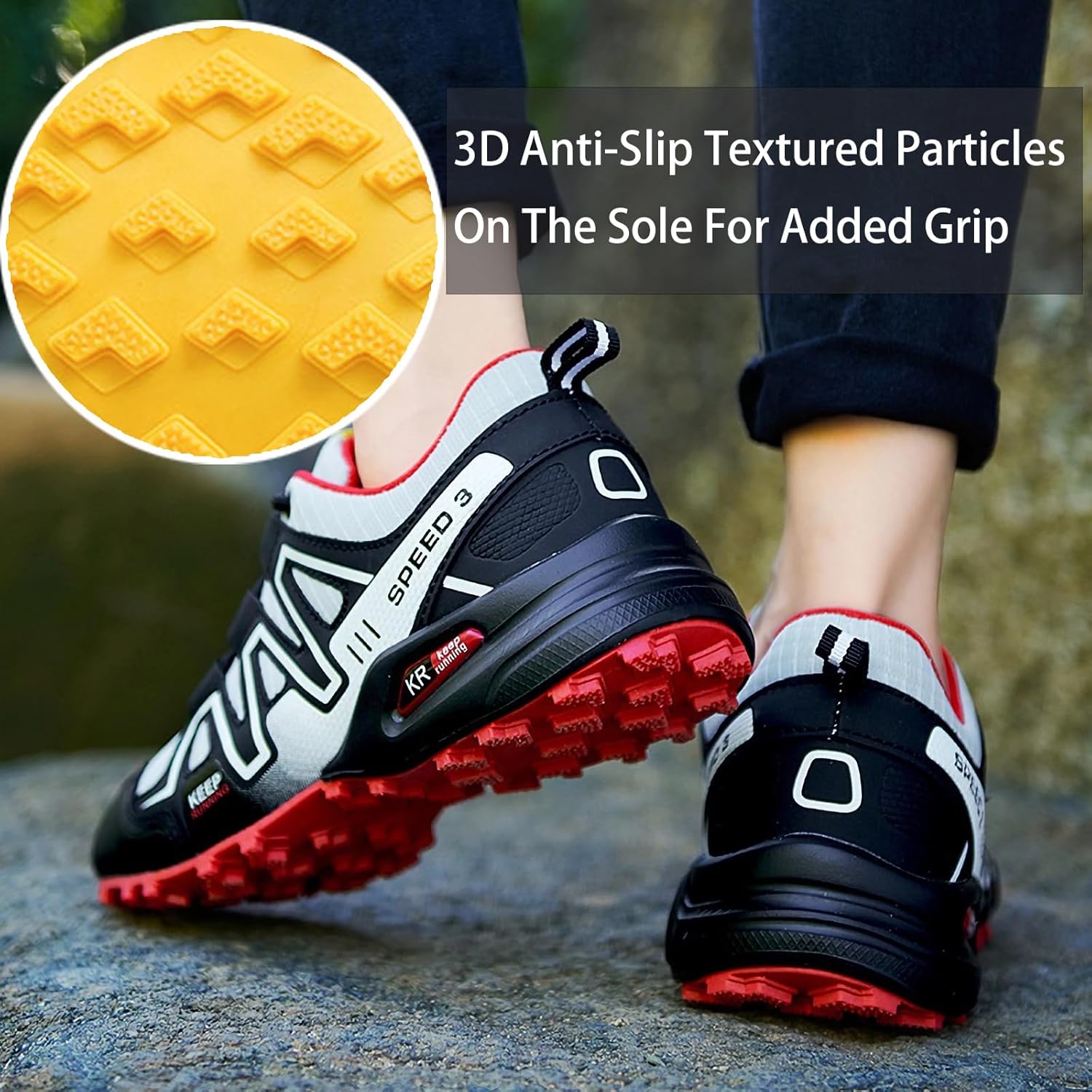 NON-SLIP TEXTURED OUTSOLE:The womens hiking shoes have a richly textured outsole for excellent grip on a variety of terrain, from rocky surfaces and muddy trails to slippery slopes and wet conditions.