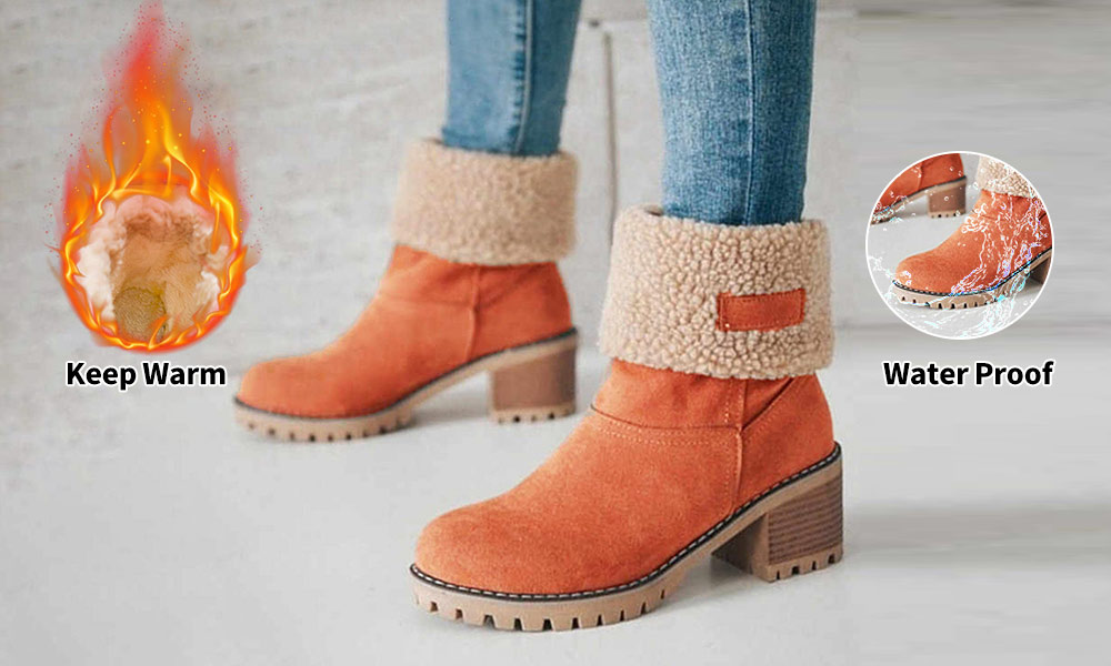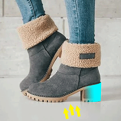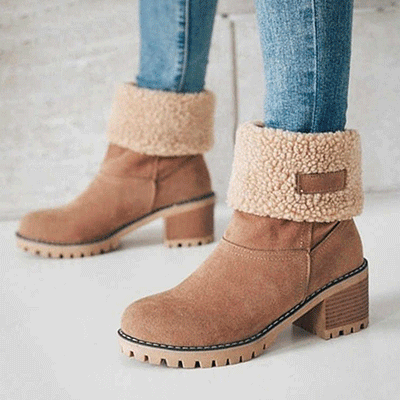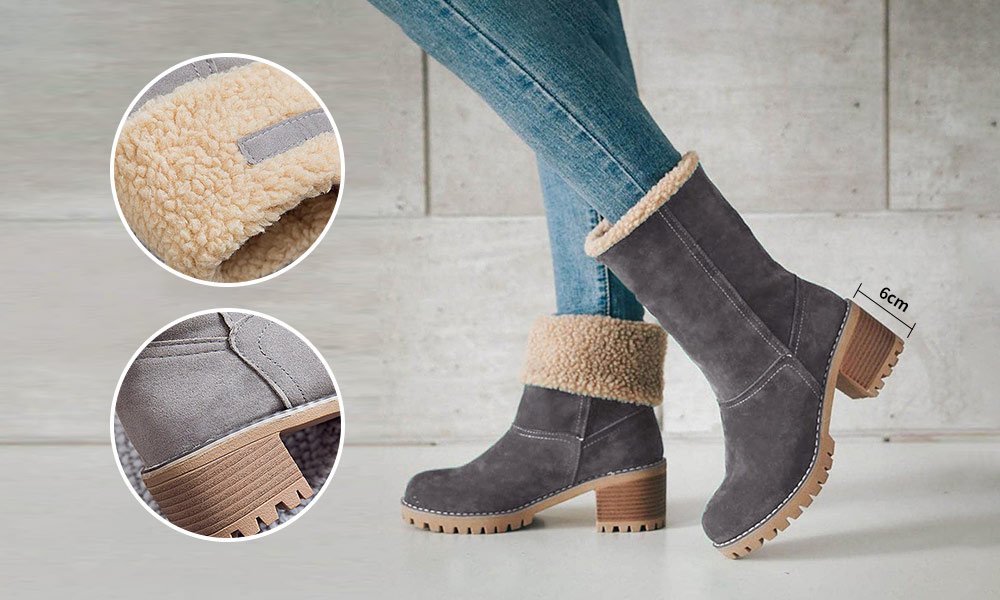 These winter boots are a combination of chunky heel with 6 cm heights and lamb wool top line. In this way, it can not only keep warm and comfy, but also it can meet height needs.