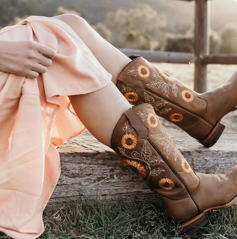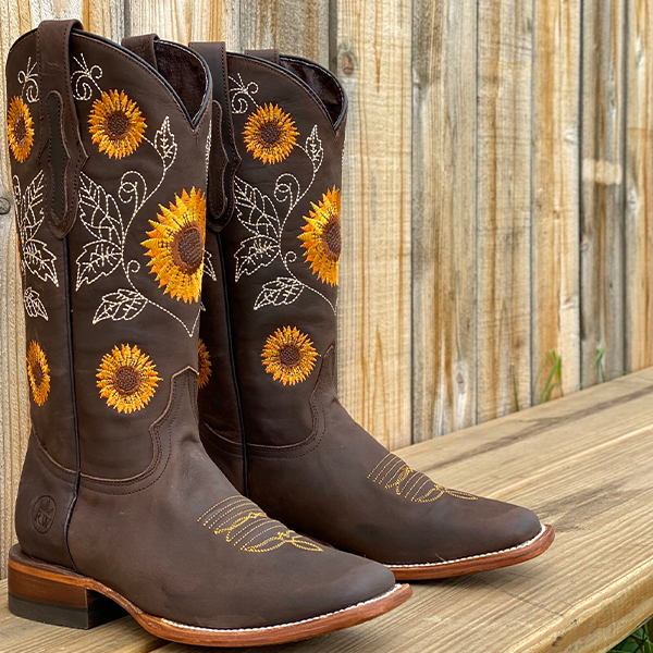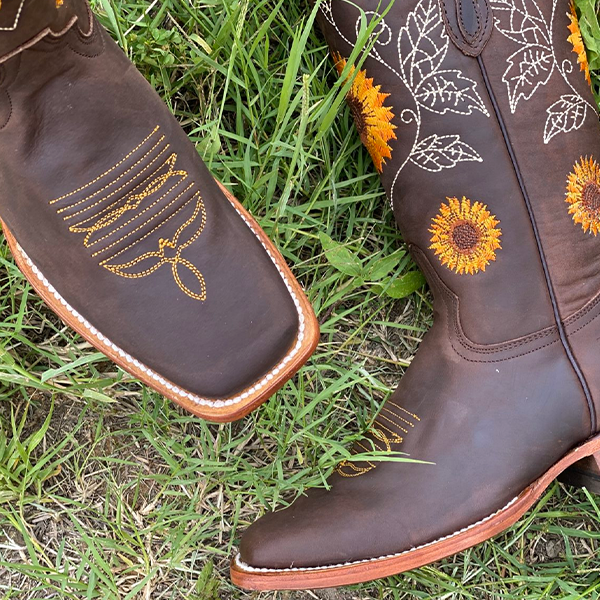 Hello Sunflower... Or should I say the "Happy Flower" because I'm pretty sure these cowgirl boots made you smile. This is a classic snip toe cowgirl boot, perfect for your country outings having fun, date nights, or country weddings. It features a gorgeous embroidered Girasol design, butter-soft smooth teal pig lining, and a traditional leather insole. Just like a sunflower, you'll sure stand out from the crowd.