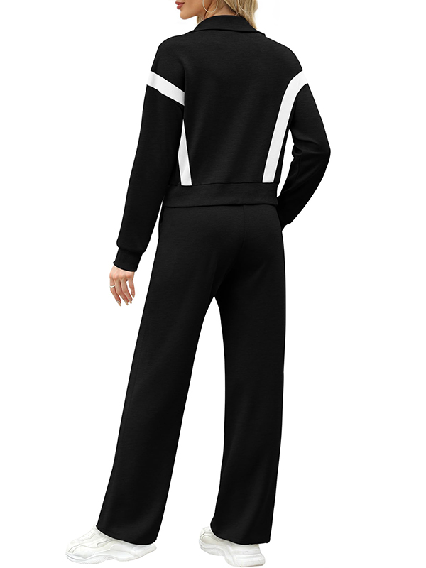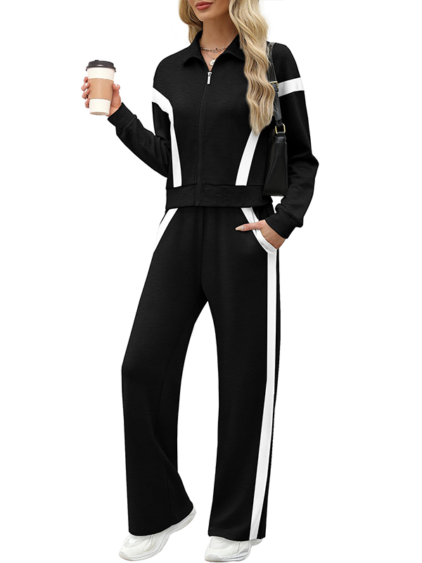 Features a full-zip long-sleeve sweatshirt and wide-leg sweatpants, both with convenient pockets, and is available in a classic solid color or a unique color block design.