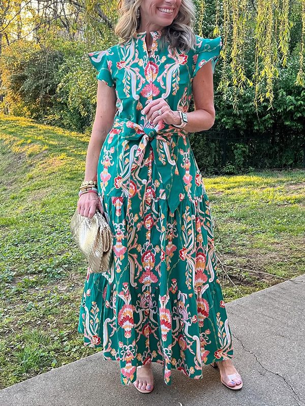 The Ruffle Button Tie Printed Dress is designed for the modern woman who cares about sophistication and style. Printed with a glamorous print and elegant maxi length, this dress is perfect for any occasion.