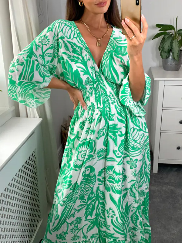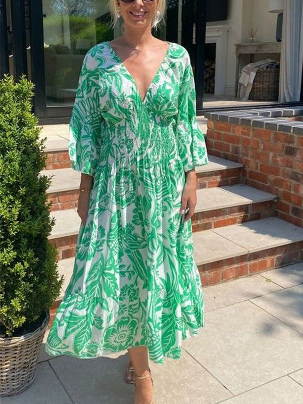 Timeless Elegance: V Neck Elastic Waist Printed Dress
