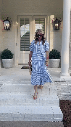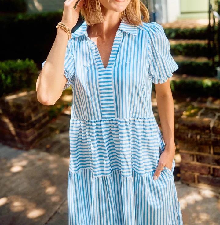 The V-Neck Pleated Short Sleeve Striped Shirt Dress is a delightful blend of sophistication and sweetness that's perfect for any occasion. Falling gracefully at midi-length, this dress exudes timeless charm, making it an ideal choice for both casual outings and special events. The dress features a classic collar, adding a touch of elegance, while the smocked short puff sleeves provide a playful and feminine twist.