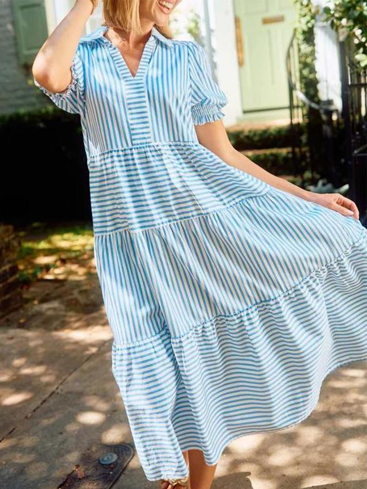 CLEARANCE🔥 Striped Split V Neck Collared Shirt Dress